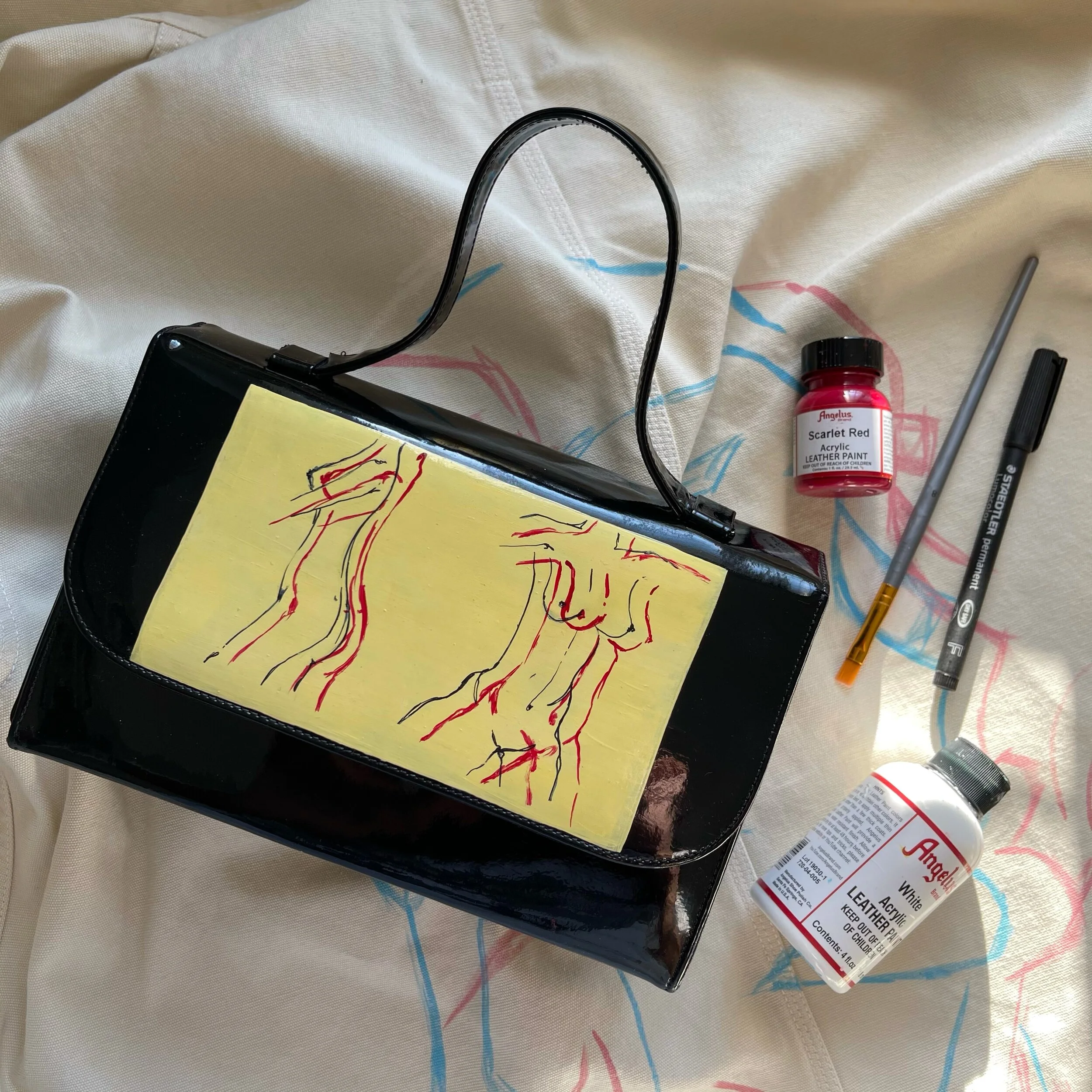 Two vintage leather black purses painted with angelus acrylic paints, sealed twice.