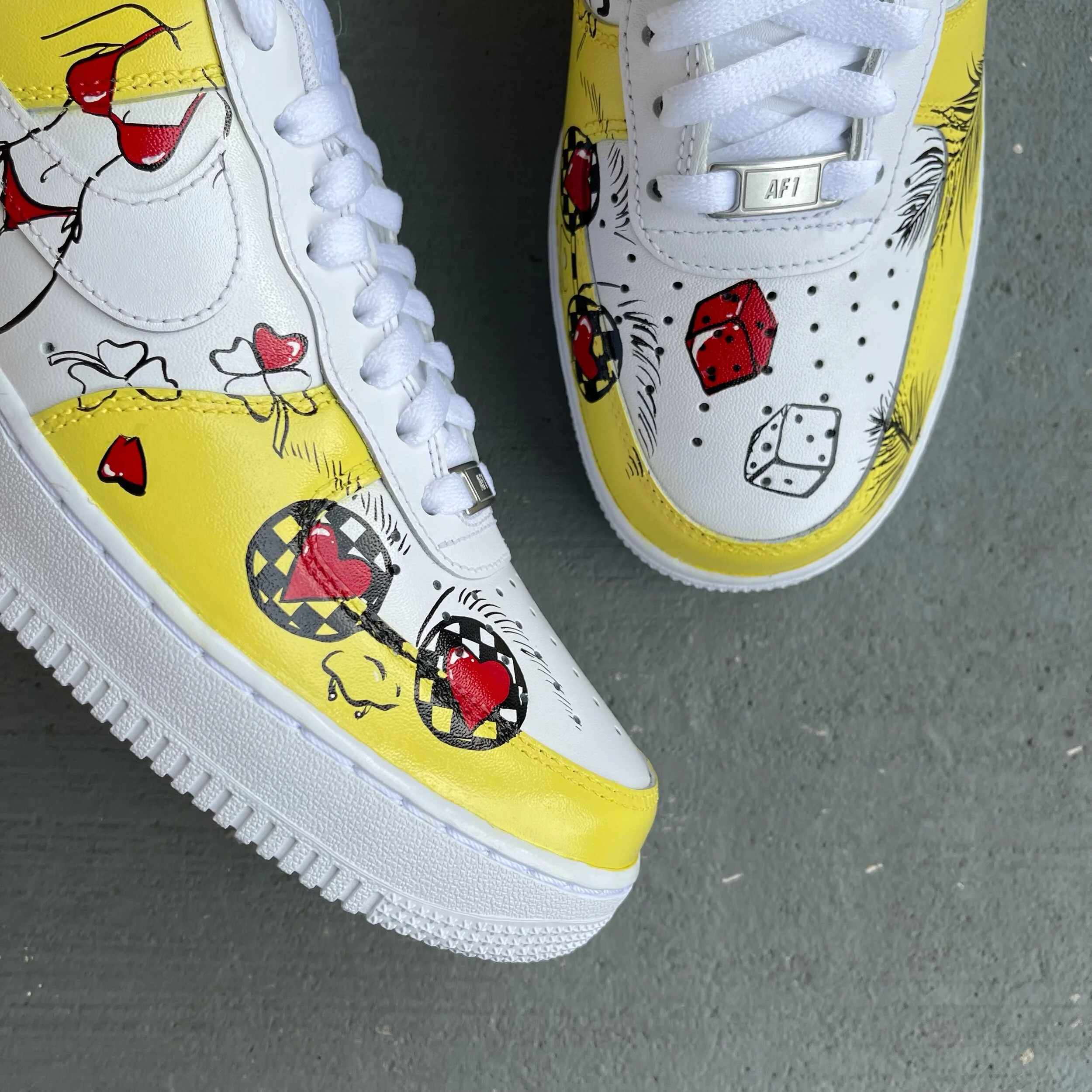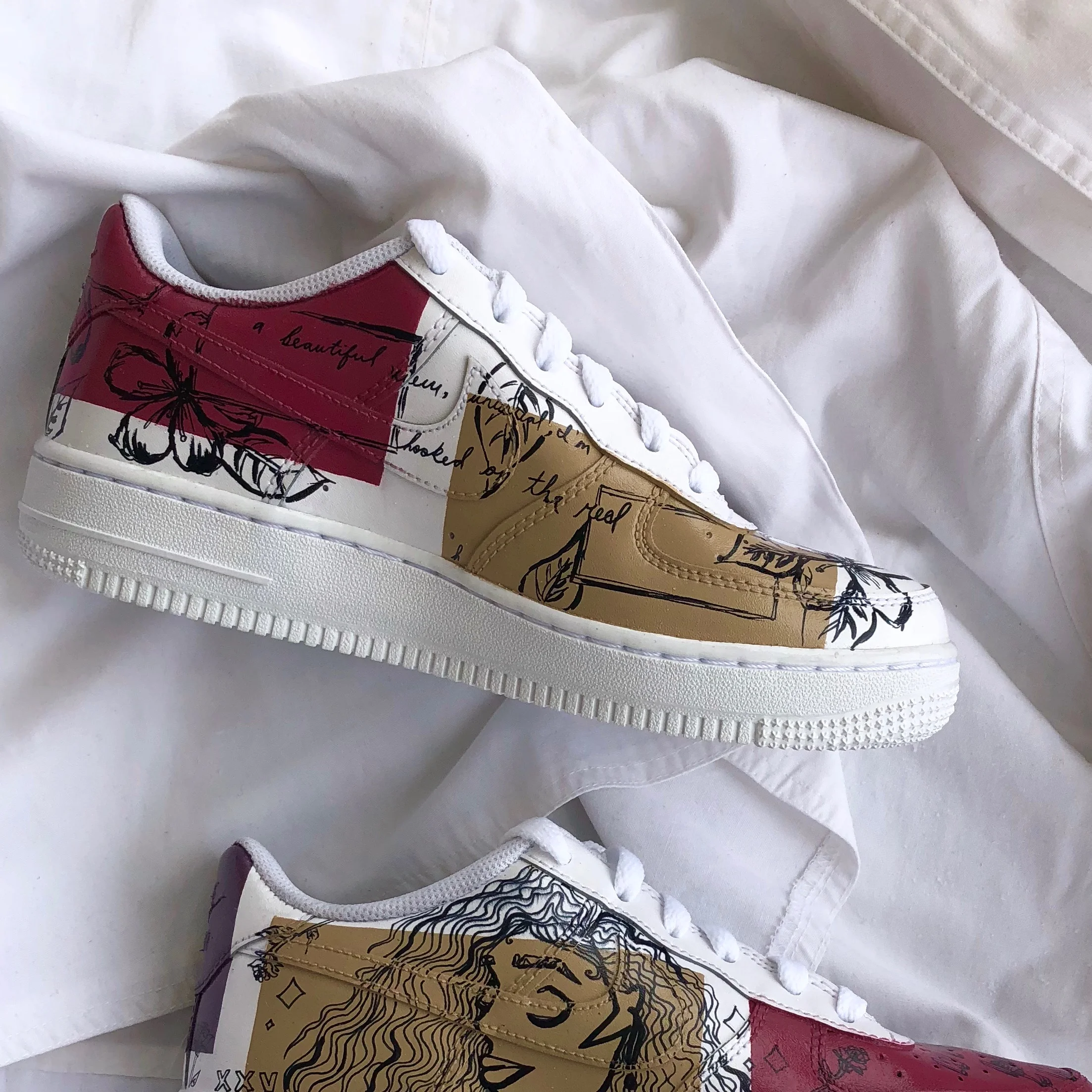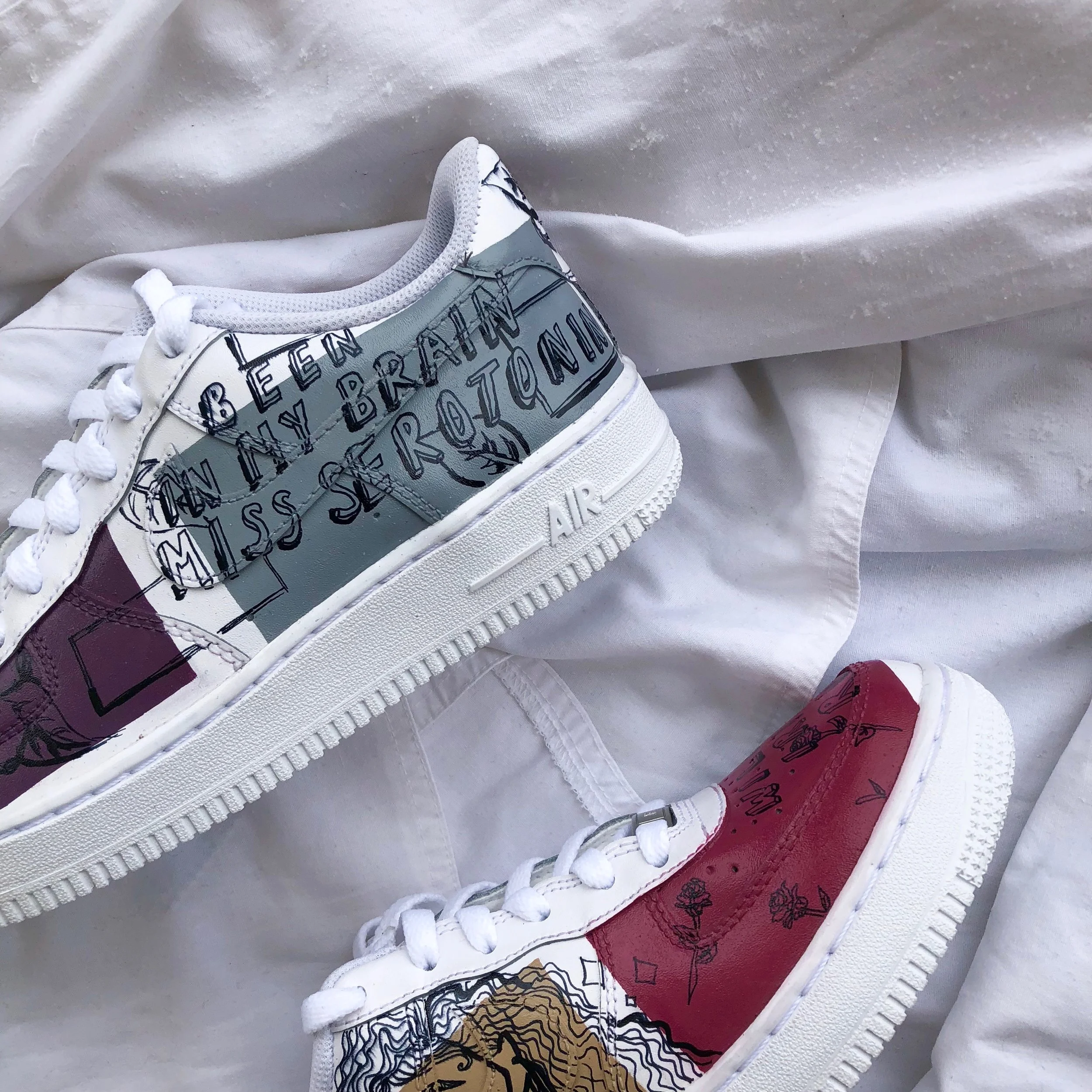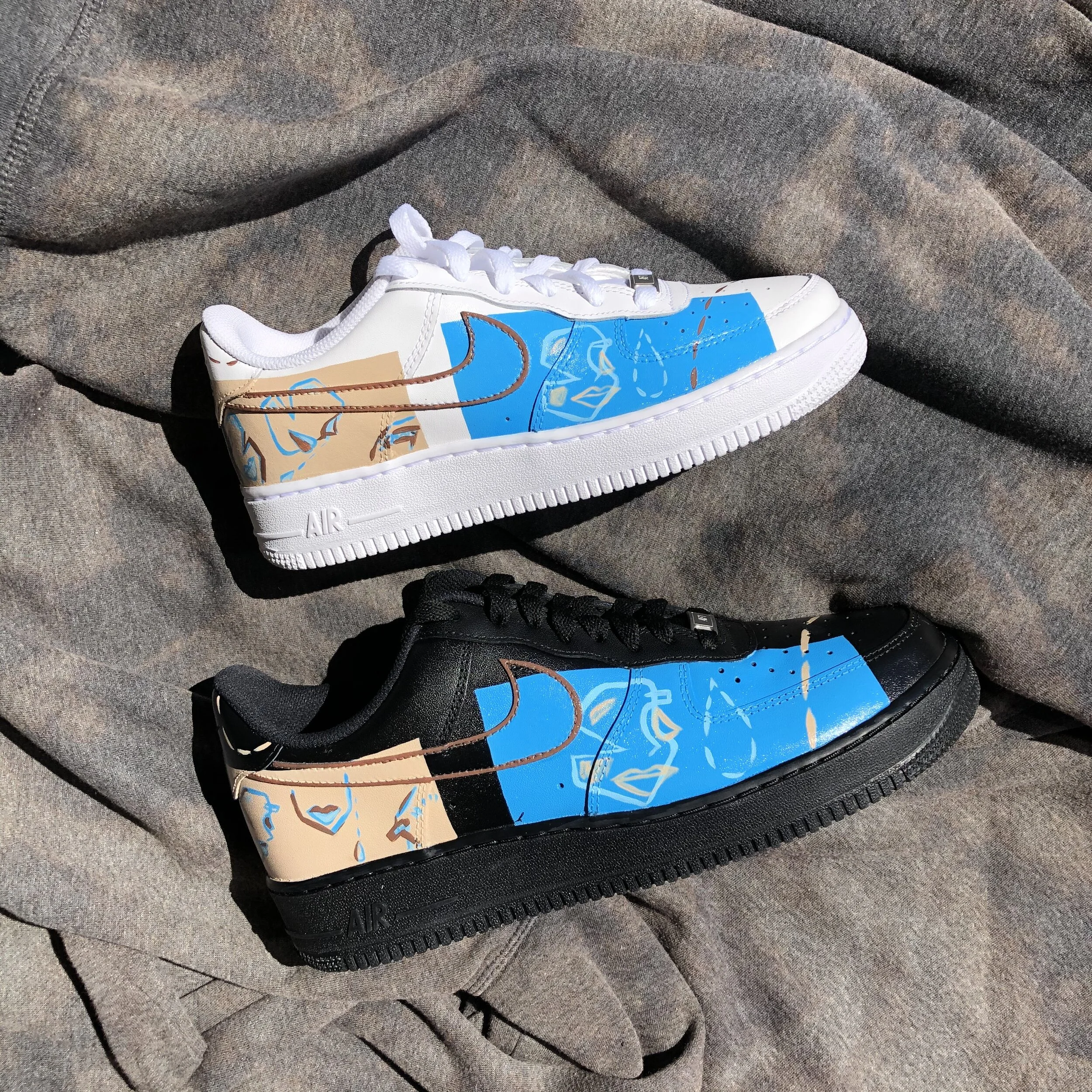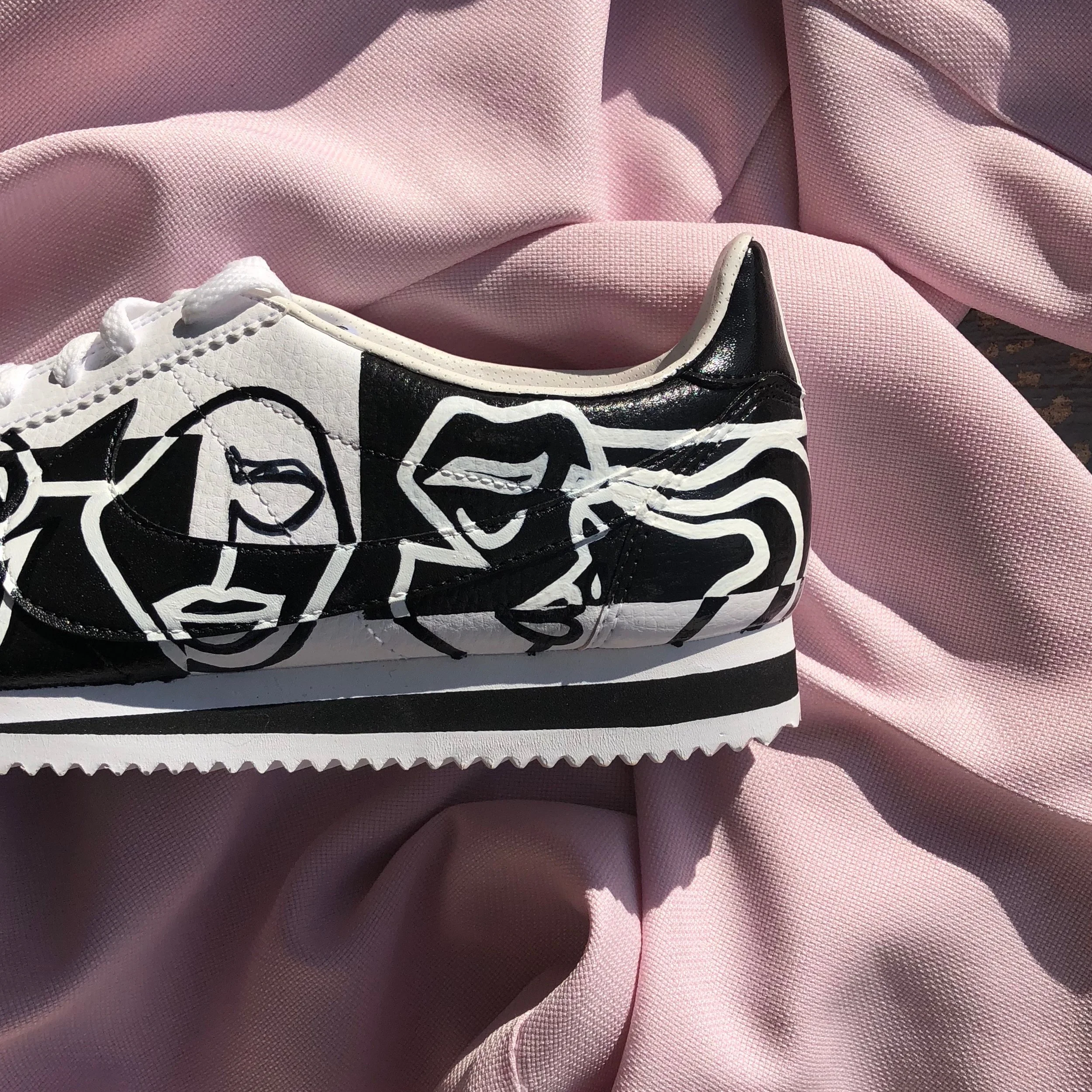 Inspired by Jean Michel Basquiat, this pair was challenging yet fun to paint. Basquiat’s work often plays with the idea of decay and dissection through using texture and abstract forms. I wanted my work to look inspired by Michel, but not a replica. I took select works (ex. “Cabra”, 1982) and interpreted them into my own style.