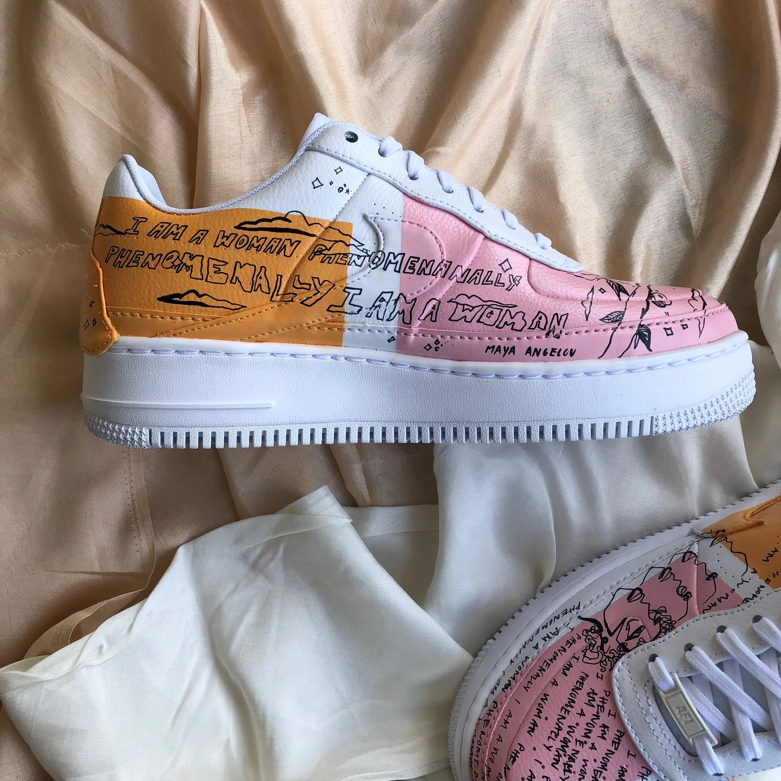 The colour way for this pair is inspired by Frank Ocean’s “Pink Matter” (and the peaches and the mangoes that you could sell for me). The women’s afros transitioned into the leaves that would lead to illustrations of mango and peach trees to symbolize organic growth and beauty. Alongside the shoe there are elements that depict a heavenly aesthetic, to compare women to the divine. Lastly, the phrase “I am a woman phenomenally” appears repeatedly on the shoes as an excerpt from Maya Angelou’s poem “Phenomenal Woman”. Here’s to being inspired by the powerful women around us - and to one day, inspire others.
